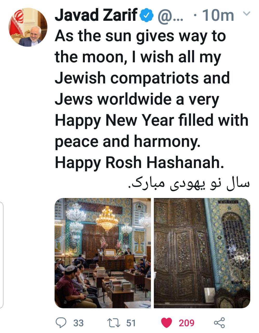 وزیر امور خارجه در توئیتی فرا رسیدن سال نوی یهودی را به هموطنان کلیمی و یهودیان سراسر جهان تبریک گفت