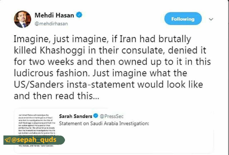 مجری الجزیره نوشت: تصور کنید، فقط تصور کنید ایران خاشقچی را داخل کنسولگری اش می کشت، دو هفته انکارش می کرد و بعد اینقدر مضحک آن را گردن می گرفت. تصور کنید بیانیه آمریکا آن موقع چطور بود. بعد بیانیه (کاخ سفید) را بخوانید.